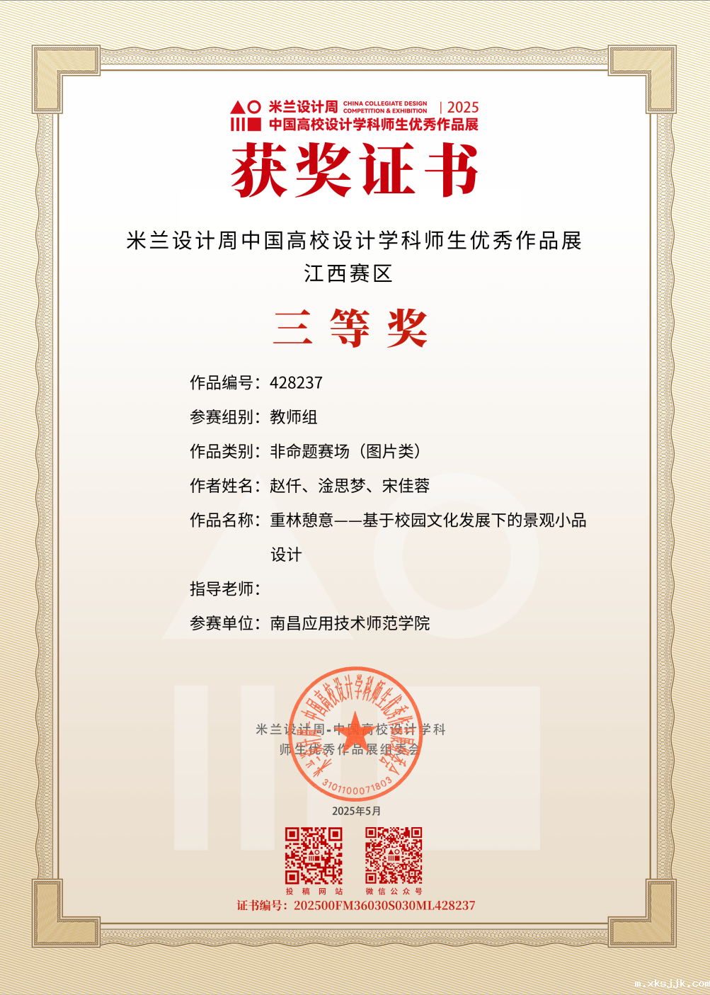 赵仟老师团队以作品《重林憩意——基于校园文化发展下的景观小品设计》斩获米兰设计周江西赛区三等奖。该作品以校园文化为切入点,通过创新的景观小品设计展现了高校环境与人文精神的有机融合。