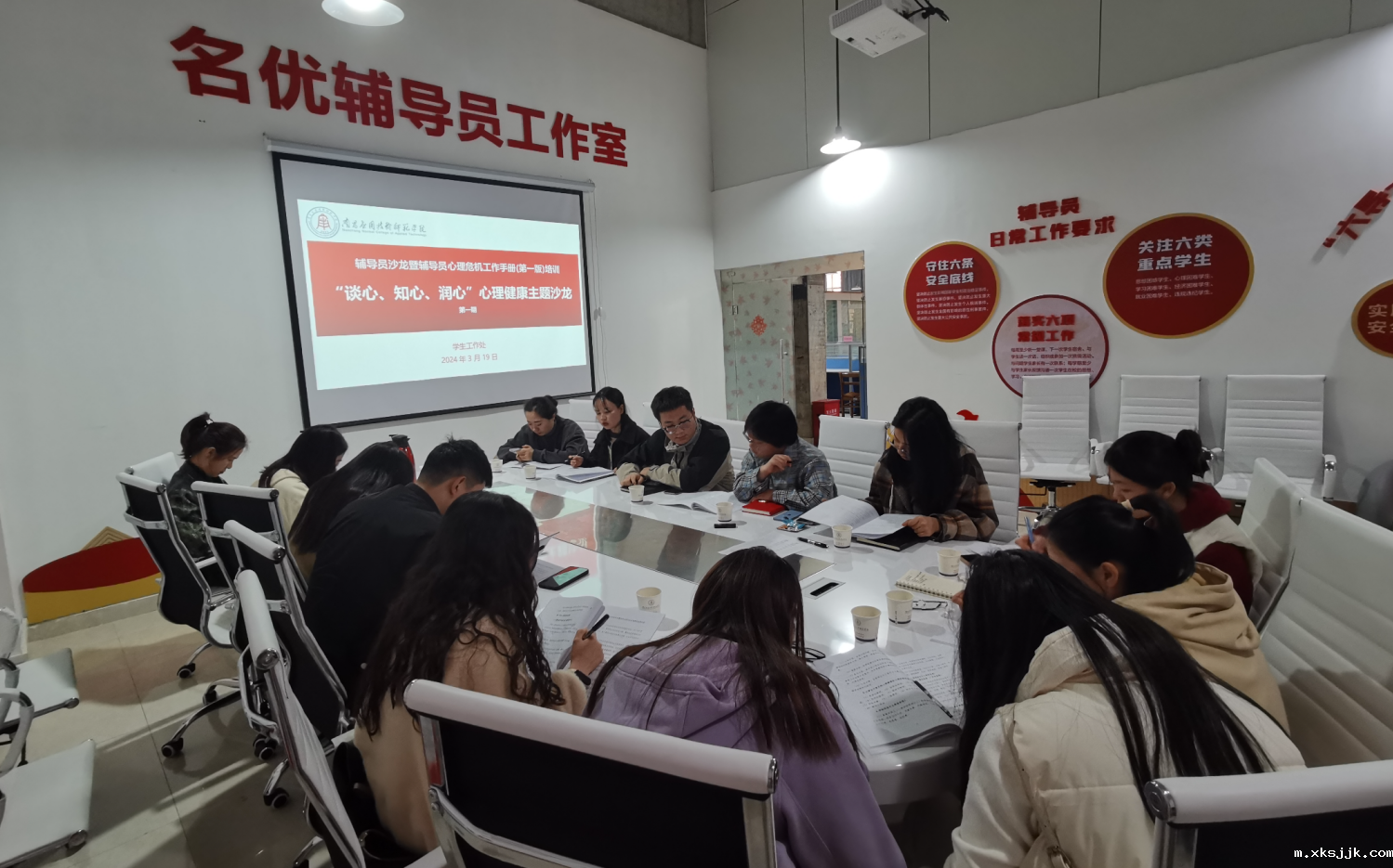 为进一步加强辅导员队伍建设,提升育人成效,促进学生心理健康发展,3月20日,学生工作处在名优辅导员工作室隆重举办了以“谈心、知心、润心”心理健康为主题的辅导员沙龙(第一期)暨辅导员心理危机工作手册(第一版)培训。此次活动旨在通过分享交流、学习探讨,共同提升辅导员在学生心理危机干预方面的专业能力和应对水平,大一年级组全体辅导员和学生工作处相关人员共同参加了此次培训。