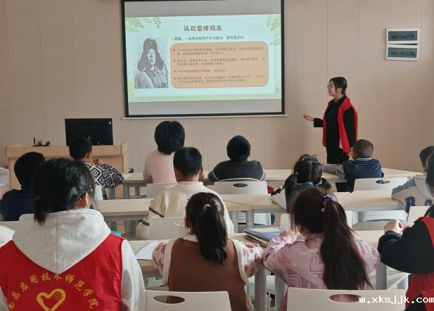 课堂上,志愿者通过播放视频,生动再现了雷锋的故事。打满补丁的袜子、夜校昏暗黄灯下的粉笔字,画面跃入童眸,让雷锋精神在孩子们的心中生根发芽。志愿者向孩子们介绍了一系列具有奉献精神的人物,并鼓励孩子们践行于实践当中,从身边小事做起。